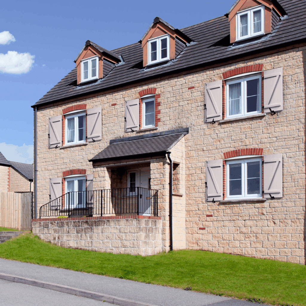 Maison traditionnelle : préférez les associations douces, par exemple une façade pierre + fenêtres gris clair + volets bois naturel