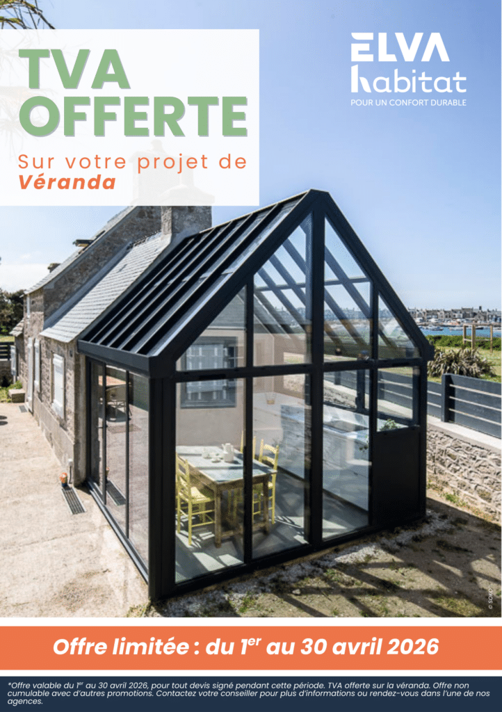 Du 1er au 30 avril 2026, ELVA Habitat vous offre la TVA sur votre projet de véranda !