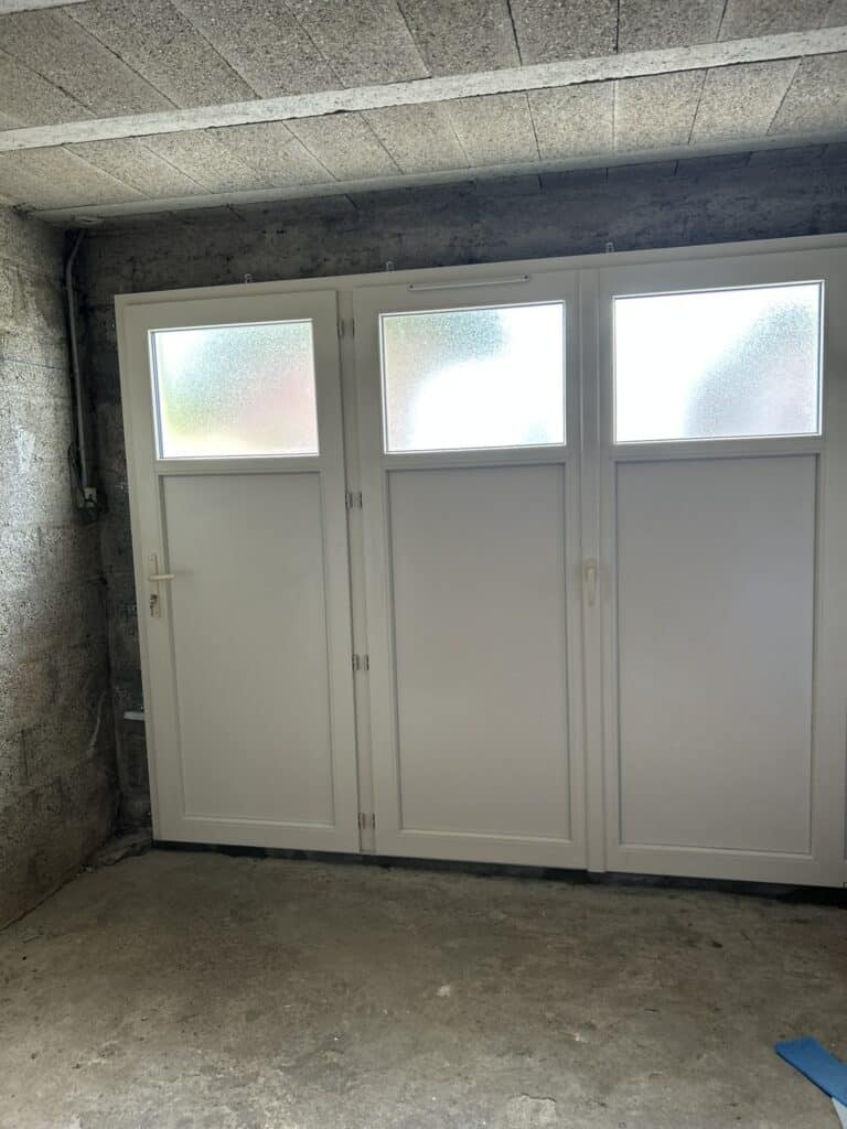 Leur ancienne installation n’était plus adaptée : manque de luminosité, isolation thermique insuffisante et manipulation peu pratique pour un usage répété. Ils recherchaient une solution qui puisse offrir la simplicité d’une porte d’entrée tout en conservant la largeur de passage nécessaire pour entrer du matériel encombrant ou des objets volumineux.